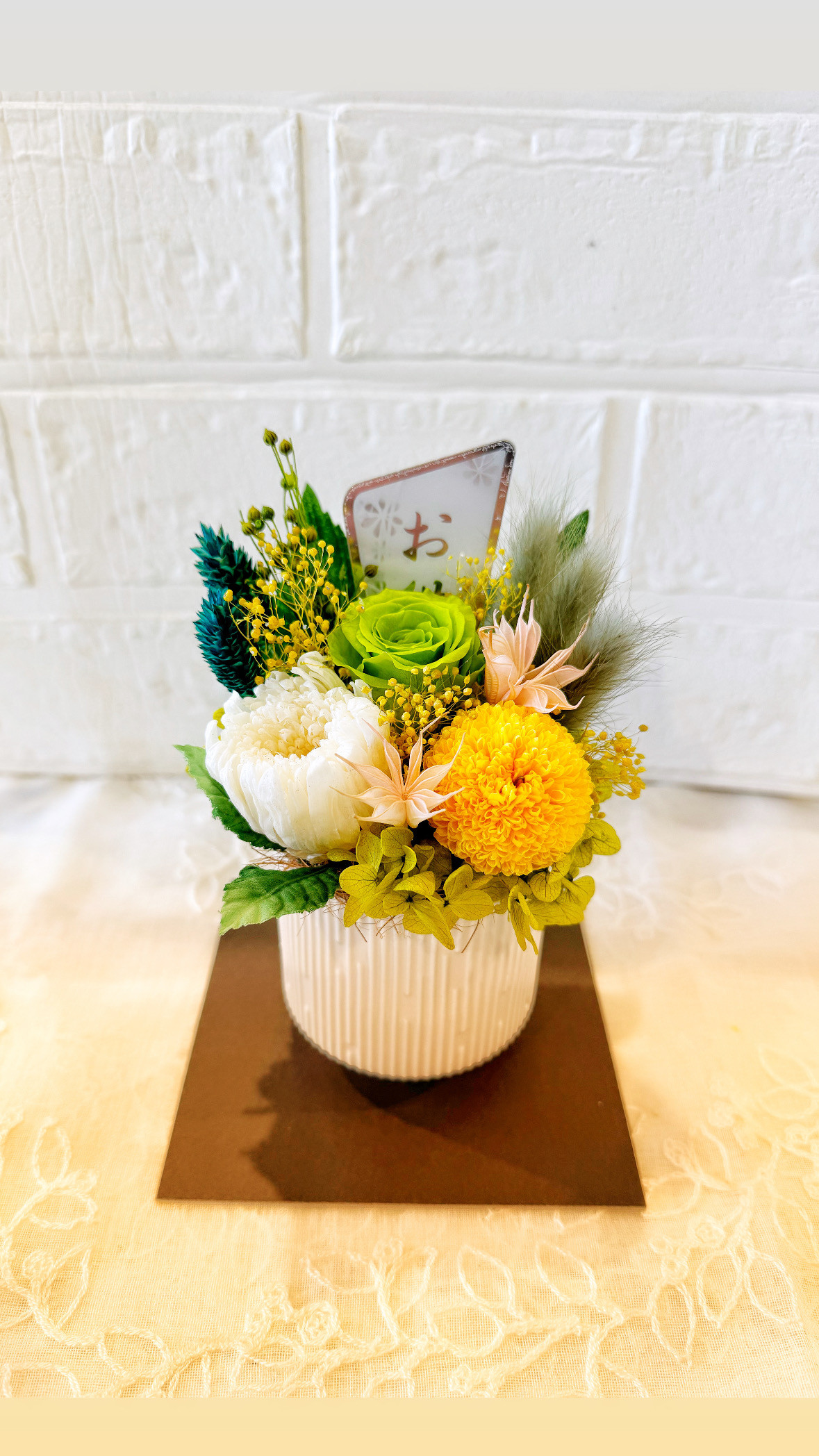 プリザーブドフラワーを使ったお供えアレンジです。 黄色や緑でお供え感を出しています。 重たすぎず明るすぎない色合いがお供えにぴったりの贈り物です。近年ではバラを使うことも多く色使いによりお供えものとして贈られることが多くなりました。 プリザーブドフラワーとは生花のうちに一度色を抜き特殊な塗料で再度色付け作業をして作られています。 また直射日光や湿度により劣化を早めることがあり通常3年〜5年と言われていますが実際には5年以上持ちます。 色鮮やかな見た目や手触りも生花と同じように柔らかくみずみずしさがあります。 プリザーブドフラワーはホコリが付くと取れにくいため専用のプリスタイルケースに入れての販売となります。 サイズ:W12×H16㎝ 素材:プリザーブドフラワー 送料:1230円〜(地域により異なります) 発送:入金確認後5日以内 ※配送はヤマト運輸にてお届けいたします。 お届け希望日/ご希望の時間帯 ご希望がございましたら備考欄にご記入下さい。 午前中 14時-16時 16時-18時 18時-20時 19時-21時 ※ギフト発送の場合 送り主様のお名前、ご住所、ご連絡先を備考欄にご記入下さい。 ※ラッピング無料 リボン、シールは仕入れにより異なる場合がございますのでご了承下さいませ。 |